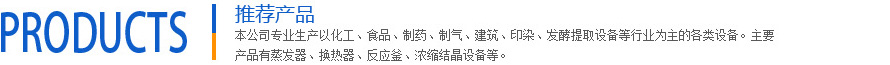 本公司專業生產以化工、食品、制藥、制氣、建筑、印染等行業為主的各類設備。主要產品有發酵提取設備,濃縮結晶設備,蒸發器、換熱器、反應釜、分離容器、儲罐、熱交換器、冷凝器,全自動供水設備、不銹鋼裝配式水箱、凝結水回收等各類壓力容器及非標產品。其中離心式刮板薄膜蒸發器獲江蘇省優質產品。